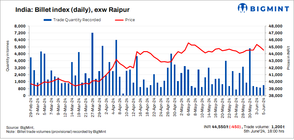 BigMint’s billet index declined by INR 450/tonne (t) to INR 44,550/t exw Raipur on 5 June, 2024.