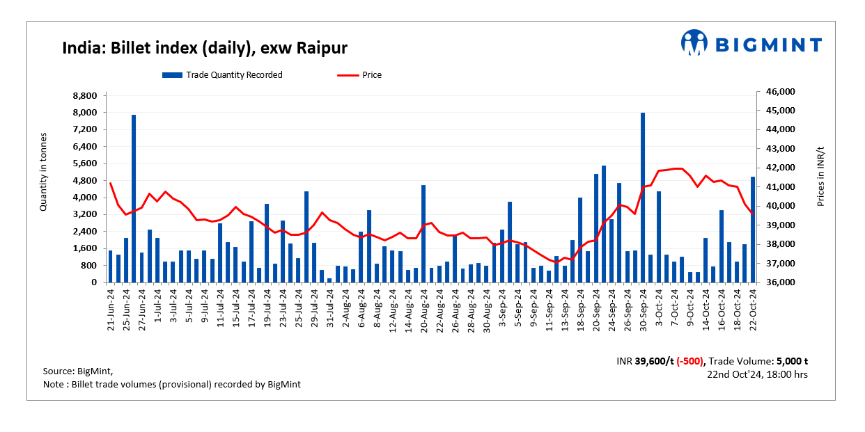 BigMint’s billet index dropped further by INR 500/tonne (t) d-o-d to INR 39,600/t exw-Raipur on 22 October 2024.
