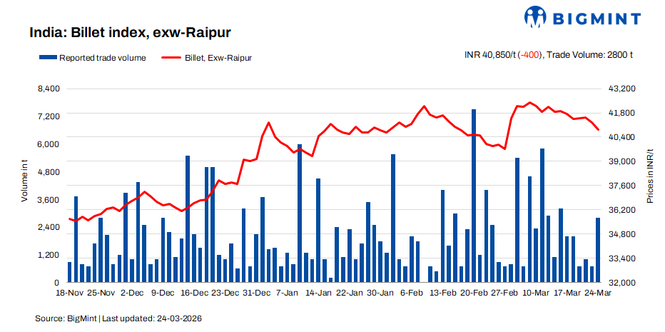 BigMint’s billet index declined by INR 400/t d-o-d to INR 40,850/t exw-Raipur on 24 March 2026, as limited market participation and weak downstream demand continued to pressure the semi-finished steel segment.