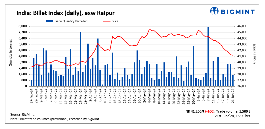 BigMint’s billet index inched down further by INR 100/tonne (t) to INR 41,200/t exw Raipur on 21 June, 2024.