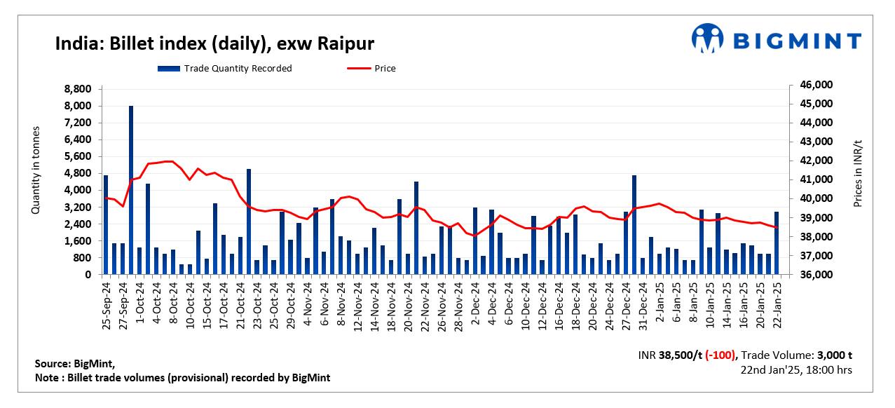 BigMint’s billet index decreased by INR 100/tonne (t) d-o-d to INR 38,500/t exw-Raipur on 22 January 2025, continuing the downtrend observed over the past two days.