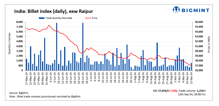 BigMint’s billet index dropped by another INR 150/tonne (t) today, settling at INR 37,050/t exw Raipur.