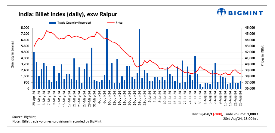 BigMint’s billet index has declined further by INR 200/tonne (t) to INR 38,450/t exw Raipur on 23 August, 2024.