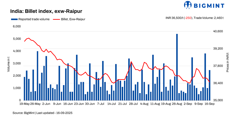 BigMint’s billet index slipped further by INR 250/t d-o-d, settling at INR 36,500/t exw-Raipur on 16 September 2025. Despite lower offers, buying interest remained weak as downstream demand continued to falter ahead of upcoming festivals.