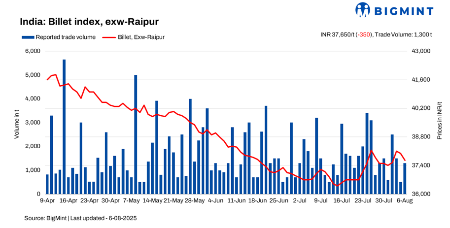 BigMint’s billet index declined further by INR 350/tonne (d-o-d), settling at INR 37,650/t exw-Raipur on 6 August 2025, as subdued demand and lower enquiry levels kept market participation subdued throughout the day.