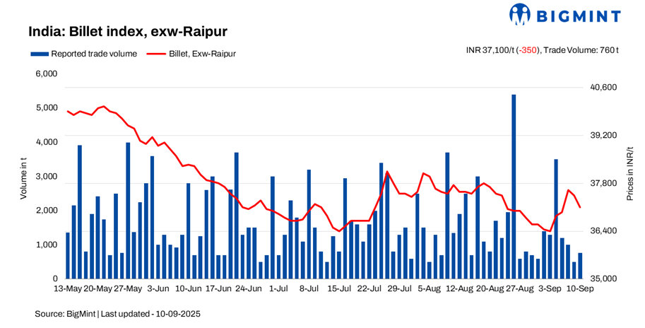 BigMint’s billet index declined by INR 350/t d-o-d, closing at INR 37,100/t exw-Raipur on 10 September 2025, as subdued demand and lower enquiry levels kept overall market participation muted.