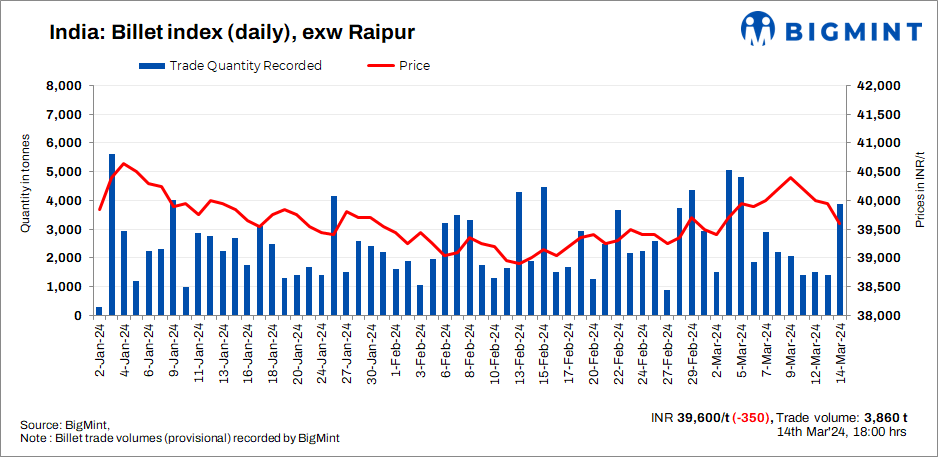 On 14 March, 2024, BigMint’s billet index experienced a notable decline, dropping further by INR 350/tonne (t) to INR 39,600/t exw-Raipur.