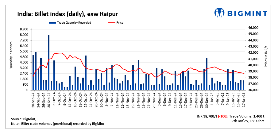 BigMint’s billet index dropped by INR 100/tonne (t) d-o-d to INR 38,700/t exw-Raipur on 17 January 2025.
