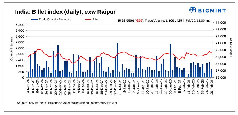 BigMint’s billet index dropped by INR 150/tonne (t) d-o-d today to INR 39,550/t exw-Raipur on 25 February 2025.