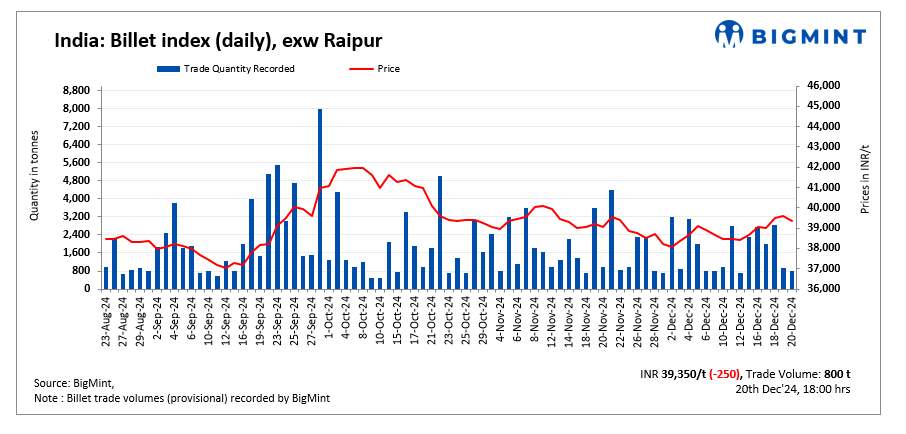 BigMint’s billet index dropped by INR 250/tonne (t) d-o-d to INR 39,350/t exw-Raipur on 20 December 2024.