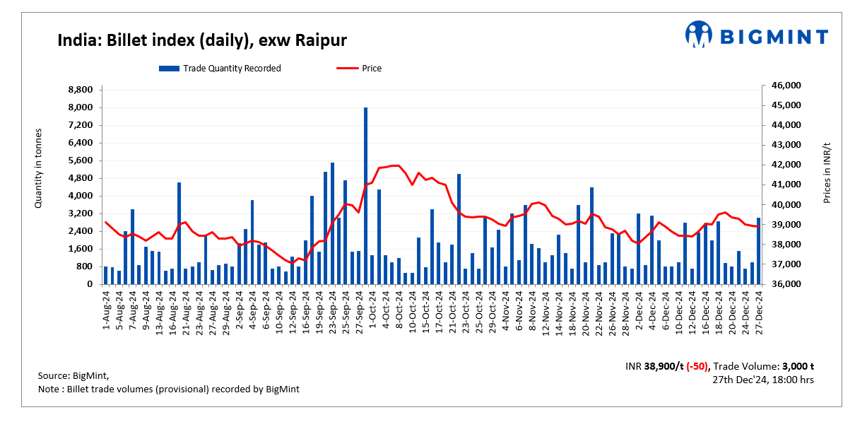 BigMint’s billet index dipped further by INR 50/tonne (t) d-o-d to INR 38,900/t exw-Raipur on 27 December 2024.