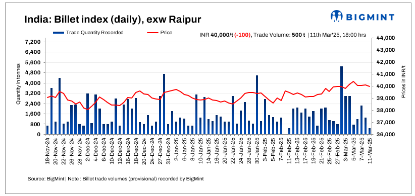 BigMint’s billet index edged lower by INR 100/t d-o-d, reaching at INR 40,000/t exw-Raipur on 11 March 2025.