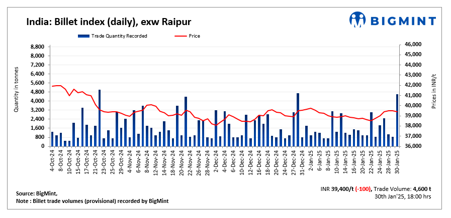 BigMint’s billet index dipped slightly today by INR 100/t, settling at INR 39,400/tonne (t) exw-Raipur on 30 January 2025.