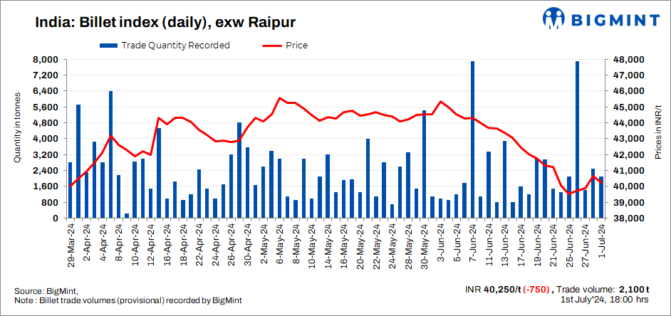 BigMint’s billet index fell by INR 750/tonne (t) d-o-d to INR 40,250/t exw-Raipur on 1 July, 2024.