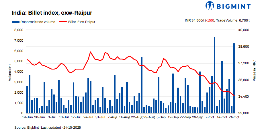 BigMint’s billet index fell by INR 150/t d-o-d to INR 34,500/t exw-Raipur on 24 October 2025. Amid the decline, trading activity improved as lower offers and post-holiday volatility supported renewed buying and restocking.