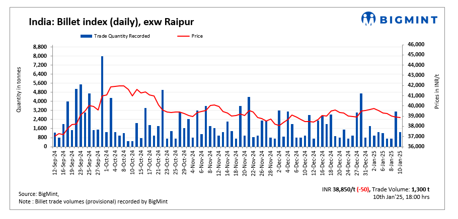 BigMint’s billet index fell slightly by INR 50/tonne (t) d-o-d to INR 38,850/t exw Raipur on 10 January 2025.