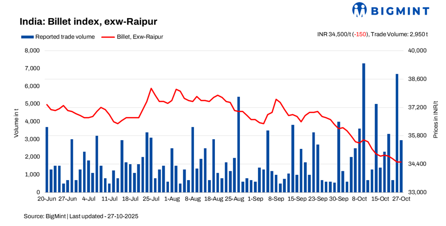 BigMint’s billet index declined by INR 150/tonne (t) d-o-d to INR 34,500/t exw-Raipur on 27 October 2025, as market activity remained modest. Despite the price correction, limited trading activity was observed, primarily in the Maharashtra market, supported by viable prices and lower offers from central India.