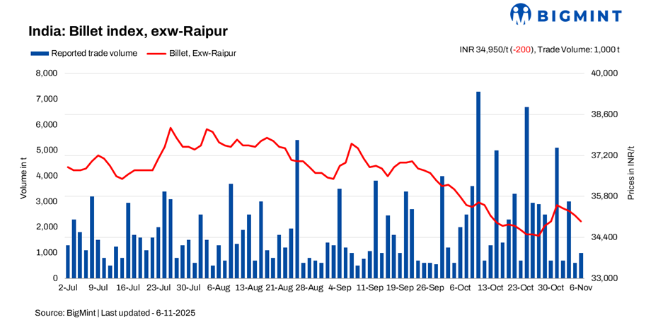 BigMint’s billet index witnessed another correction of INR 200/tonne (t) d-o-d, settling at INR 34,950/t exw-Raipur on 6 November 2025, as market sentiment remained weak amid muted buying interest and limited inquiries. Minor fluctuations were noted throughout the day, but overall activity stayed subdued, reflecting buyers’ continued cautious approach.