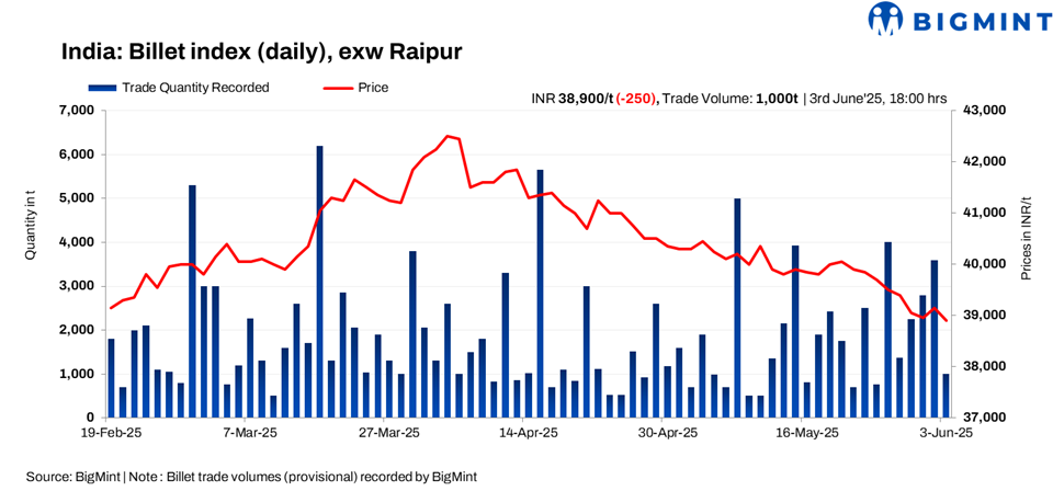 BigMint’s daily billet index witnessed a d-o-d decline of INR 250/tonne (t), settling at INR 38,900/t exw-Raipur on 3 June 2025, as only a few deals were concluded at lower price levels, while overall market activity remained subdued.