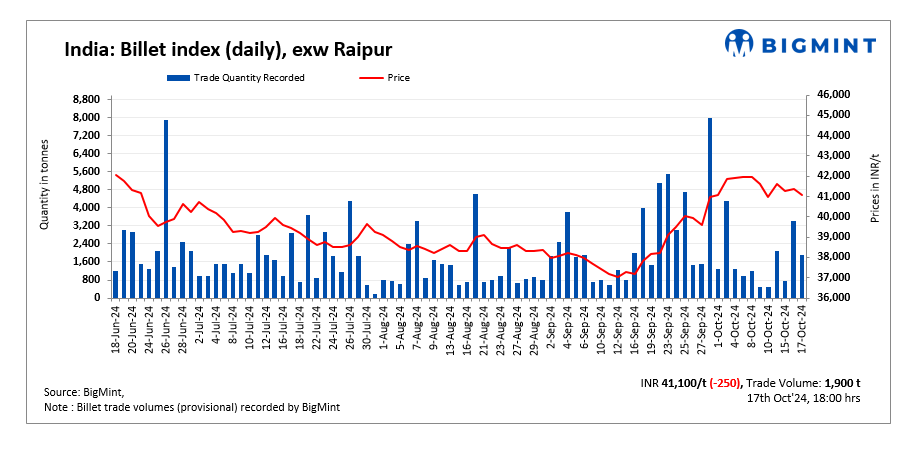 BigMint’s billet index declined by INR 250/tonne (t) d-o-d today to INR 41,100/t exw-Raipur on 17 October 2024.