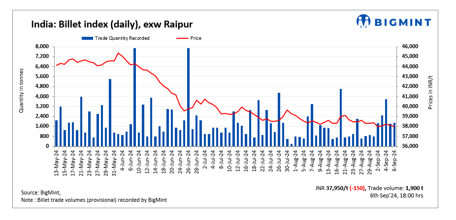 BigMint’s billet index further declined by INR 150/tonne (t) to INR 37,950/t exw-Raipur on 6 September 2024.