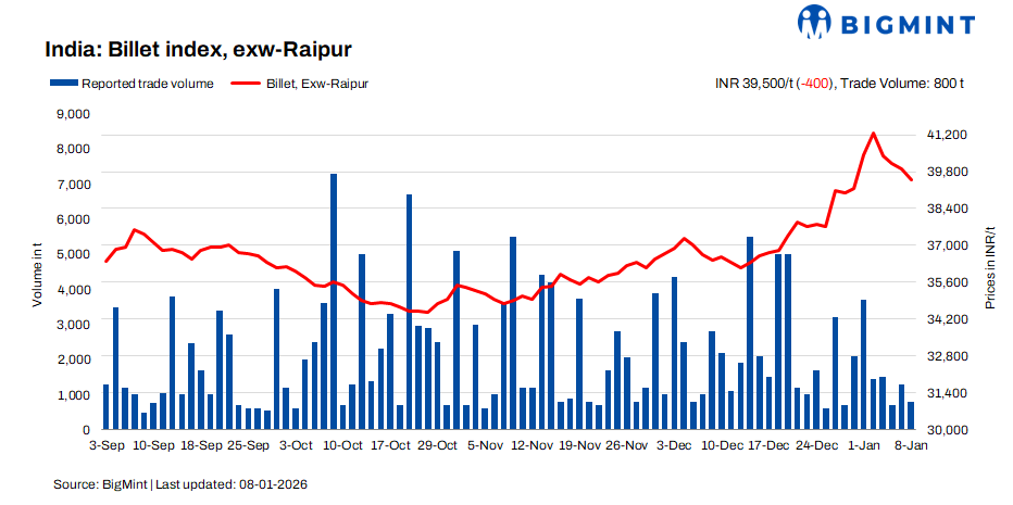 BigMint’s billet index softened further by INR 400/tonne (t) d-o-d to INR 39,500/t exw-Raipur on 8 January 2026, as weak buying interest and limited enquiries kept market sentiment subdued. The market saw major corrections towards the close of today’s trading.