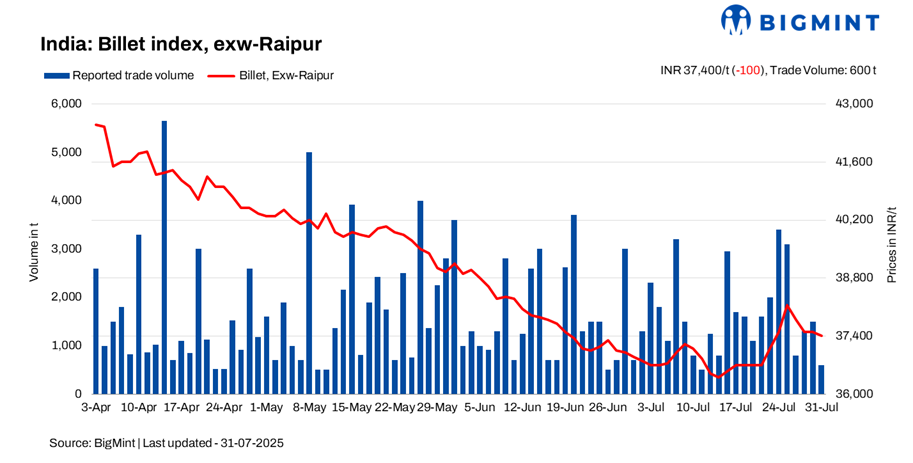 BigMint’s billet index posted a marginal day-on-day (d-o-d) decline of INR 100/tonne, settling at INR 37,400/t exw-Raipur on 31 July 2025. The market continued to reflect muted sentiment amid subdued buying interest and a cautious outlook across key trading hubs.