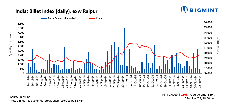 BigMint’s billet index fell slightly by INR 150/tonne (t) today, reaching INR 39,400/t exw Raipur on 22 November, 2024.
