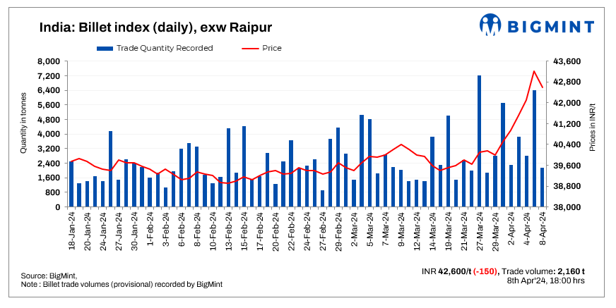 BigMint’s billet index inched down by INR 150/t to INR 42,600/t exw-Raipur on 8 April, 2024.