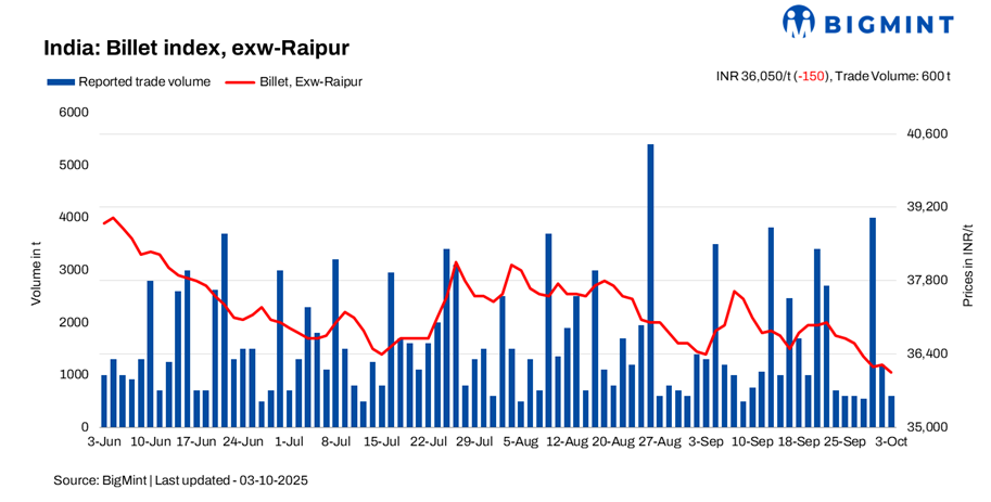 BigMint’s billet index declined by INR 150/t d-o-d, settling at INR 36,050/t exw-Raipur on 3 October 2025, as persistent weakness in downstream demand and cautious buyer sentiment kept the semi-finished steel market under pressure.