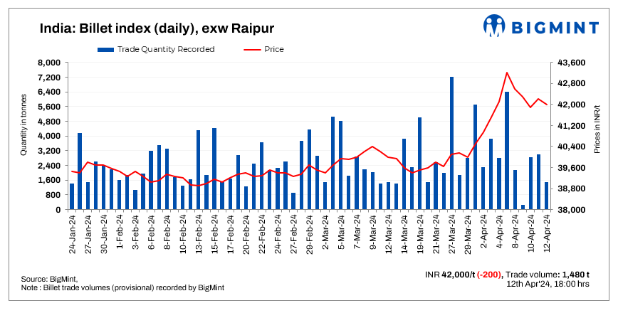 BigMint’s billet index inched down by INR 200/t to INR 42,000/t exw-Raipur on 12 April, 2024.