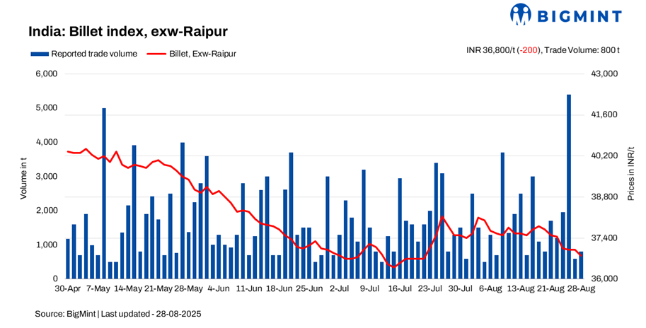 BigMint’s daily billet index slipped by INR 200/t d-o-d to INR 36,800/t exw-Raipur on 28 August 2025. The decline was driven by weak buying demand and slower market activity despite lower spot offers aimed at stimulating sales.