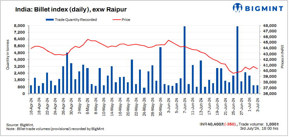 BigMint’s billet index fell by INR 350/t to INR 40,400/t exw-Raipur on 3 July, 2024.