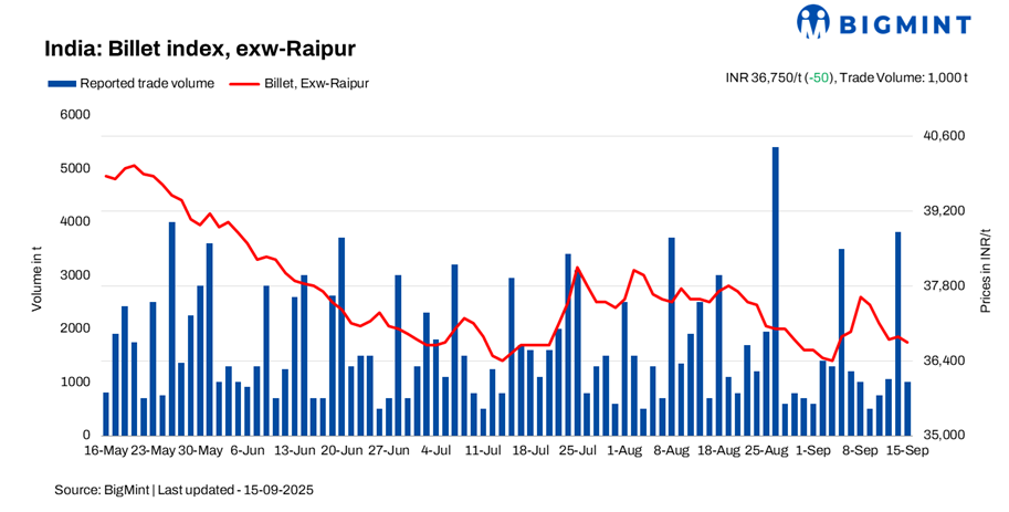 BigMint’s billet index slipped INR 100/t d-o-d, settling at INR 36,750/t exw-Raipur on 15 September 2025, as weak buying interest and muted enquiries weighed on overall sentiment. The market stayed largely range-bound, with minor corrections seen towards the end of the trading session.