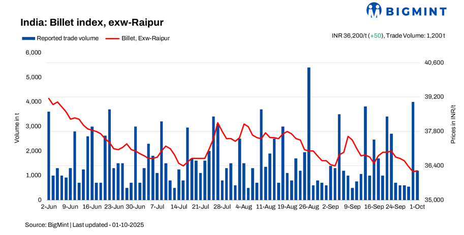 BigMint’s billet index rose marginally by INR 50/t d-o-d, settling at INR 36,200/t exw-Raipur on 1 October 2025, as weak buying interest and muted enquiries weighed on overall sentiment. The market stayed largely range-bound, with minor corrections seen towards the end of the trading session.
