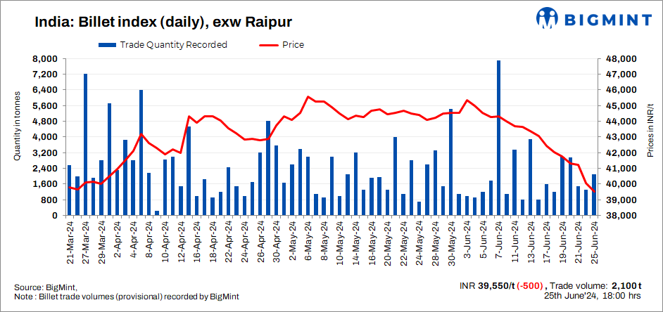 BigMint’s billet index fell to a four-month low today, decreasing by INR 500/tonne (t) to reach INR 39,550/t exw Raipur on 25 June 2024.