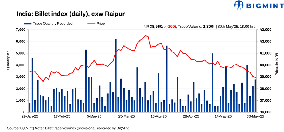 BigMint’s daily billet index registered a marginal decline of INR 100/tonne (t) day-on-day, settling at INR 38,950/t exw-Raipur on 30 May 2025, as the market maintained a range-bound tone with moderate buying activity.