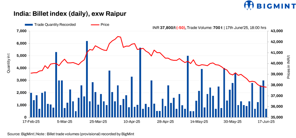 BigMint’s daily billet index edged down by INR 50/tonne (t) day-on-day, settling at INR 37,800/t exw-Raipur on 17 June 2025, as market activity remained muted amid fading buying interest.