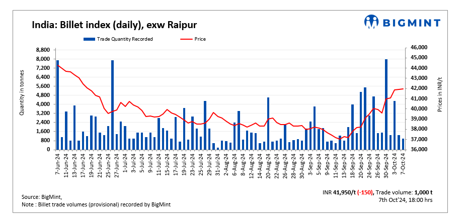 BigMint’s billet index declined marginally by INR 150/tonne (t) d-o-d today, settling at INR 41,950/t exw-Raipur on 7 October 2024.