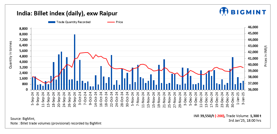 BigMint’s billet index dropped slightly by INR 200/tonne (t) d-o-d to INR 39,550/t exw-Raipur on 3 January 2025, as weak demand weighed on offers.