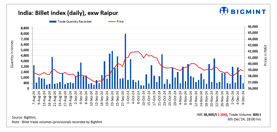 BigMint’s billet index inched down by INR 200/tonne (t) d-o-d to INR 38,900/t exw-Raipur on 6 December 2024.