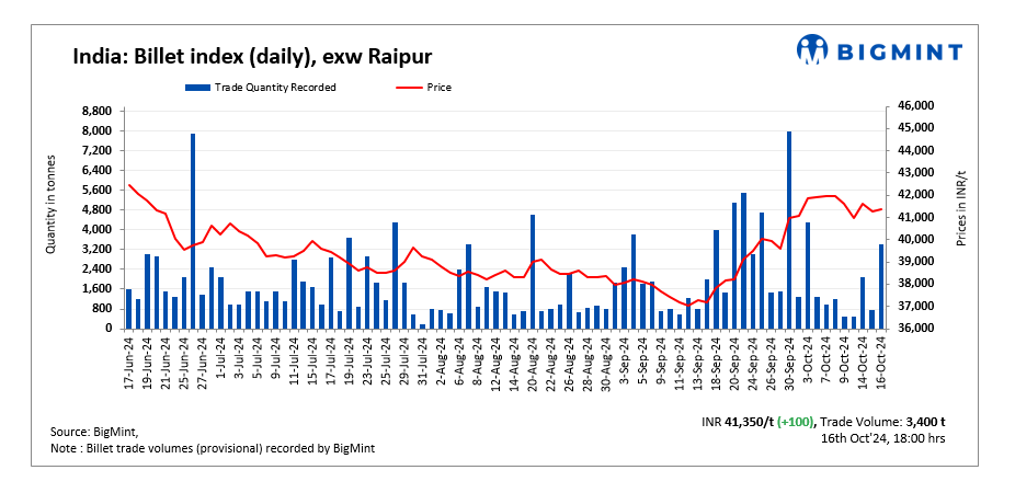 BigMint’s billet index rose slightly by INR 100/tonne (t) d-o-d to INR 41,350/t exw-Raipur on 16 October 2024.