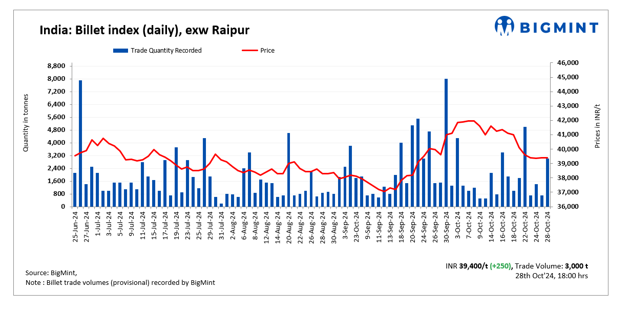 BigMint’s billet index increased marginally by INR 250/tonne (t) to INR 39,400/t exw-Raipur on 28 October 2024.