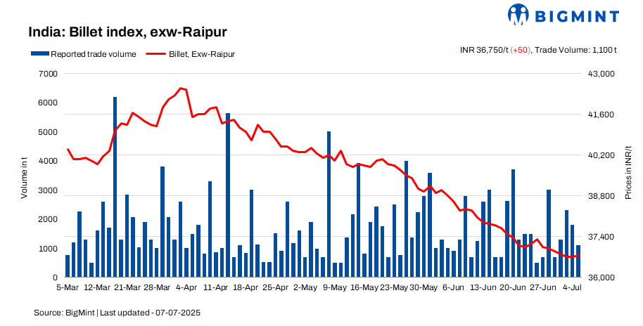 BigMint’s daily billet index dropped by INR 100/t, reaching at INR 36,750/tonne (t) exw-Raipur on 7 July 2025.