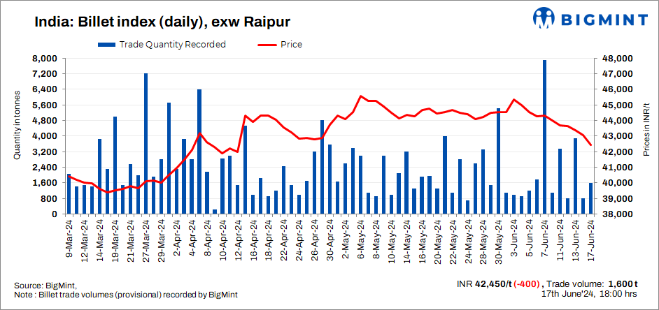 BigMint’s billet index fell by INR 400/tonne (t) to INR 42,450/t exw Raipur on 17 June, 2024.