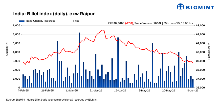 BigMint’s daily billet index dropped by INR 200/tonne (t) day-on-day (d-o-d), settling at INR 38,800/t exw-Raipur on 5 June 2025. The market witnessed continued sluggishness in demand, extending the downtrend for a second consecutive trading session.