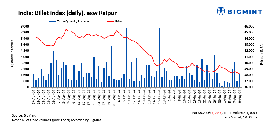 BigMint’s billet index declined further by INR 200/t reaching INR 38,200/tonne exw-Raipur on 9 August, 2024.