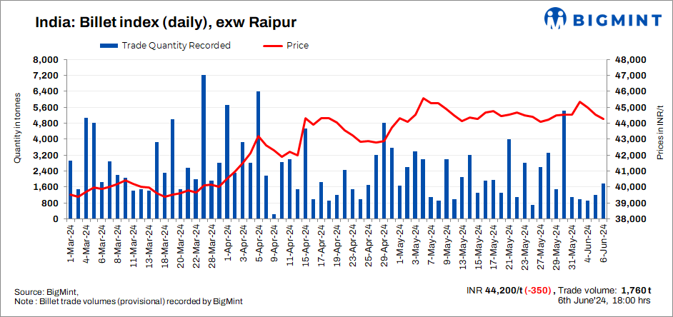 BigMint’s billet index dropped again today by INR 350/tonne (t) to INR 44,200/t exw Raipur on 6 June, 2024.