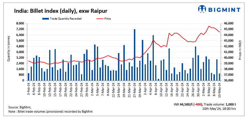 BigMint’s billet index declined further by INR 400/t, reaching INR 44,500/t exw-Raipur on 10 May, 2024.