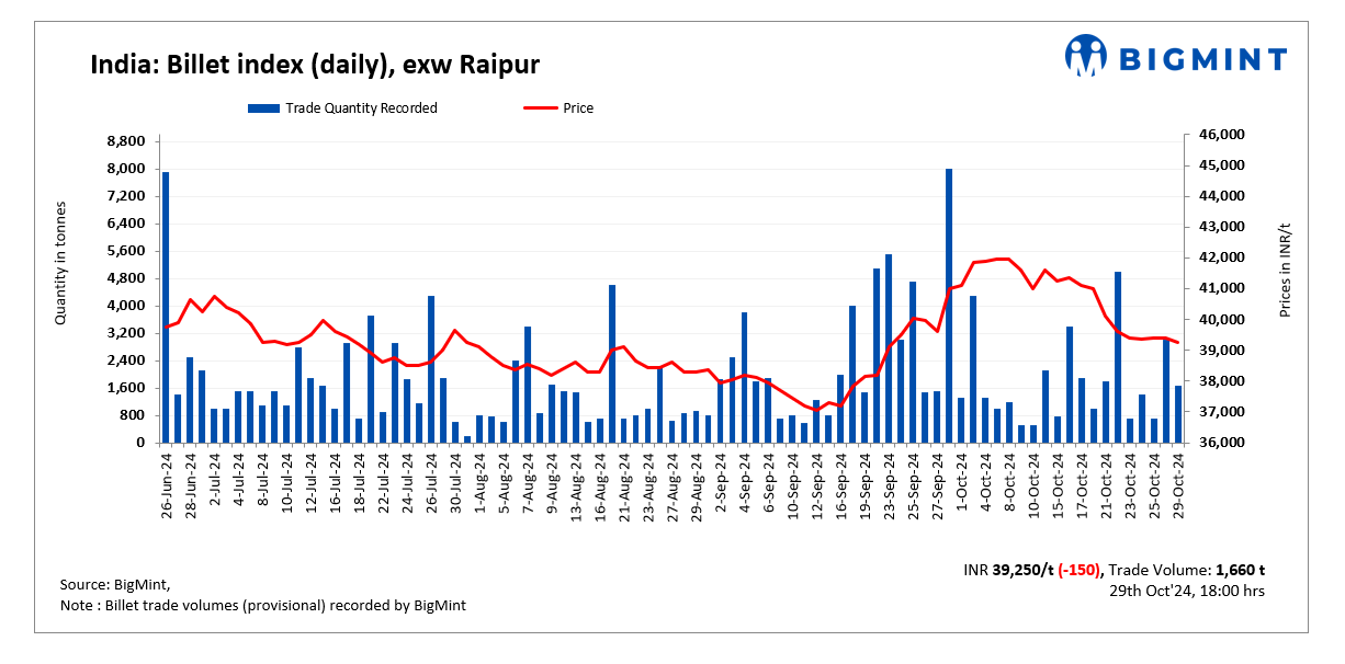 BigMint’s billet index fell marginally by INR 150/tonne (t) today, settling INR 39,250/t exw Raipur on 29 October, 2024.
